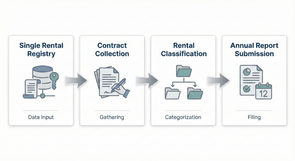 | January 1 – December 31, 2025 | Reporting period for the first annual report | Monitor rental activity; retain all documentation |
